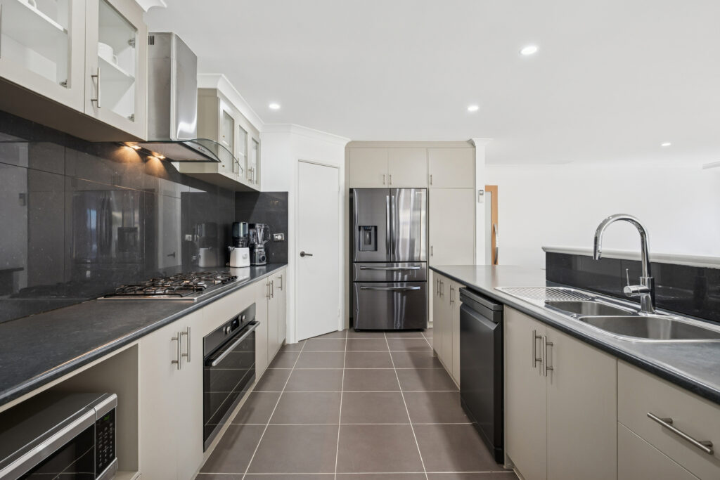 – Stainless steel appliances, island bench and glass splashbacks