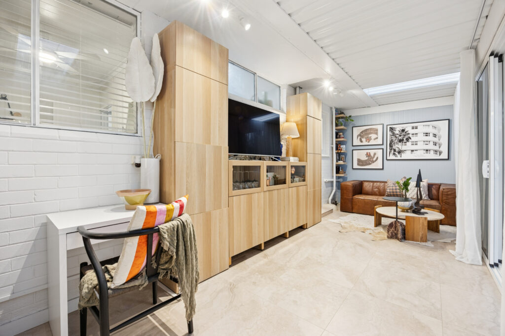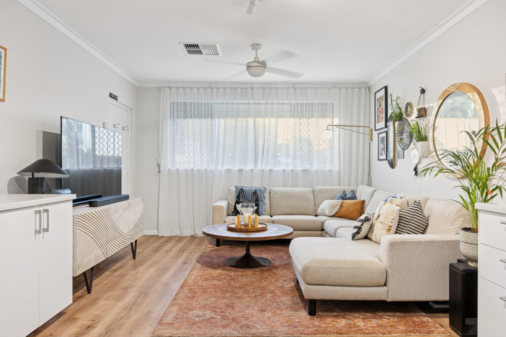The residence comprises two well-appointed bedrooms, both fitted with modern ceiling fans, while the master bedroom enjoys a generous built in wardrobe. These rooms are serviced by a stylish and functional bathroom, designed with practicality and comfort in mind. The modern kitchen flows seamlessly into the main living area, creating a welcoming sense of space. Cleverly positioned, the unique laundry nook subtly separates the living zone from the home’s true highlight, the impressive rear entertaining area. The sunroom features striking tiled flooring, an abundance of natural light from large windows and skylights, and brand-new sliding doors that open directly onto the outdoor space. From the exposed aggregate flooring to the fully covered patio, no expense has been spared. A modest grassed area and natural hedging enhance the sense of privacy, creating an outdoor setting that feels both relaxed and inviting.