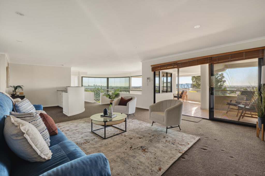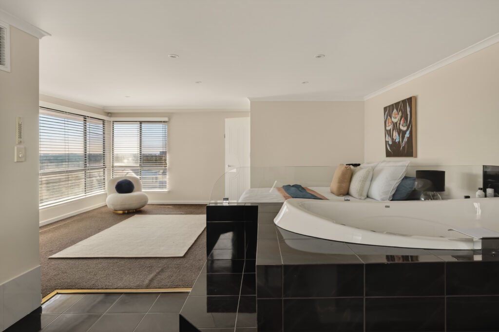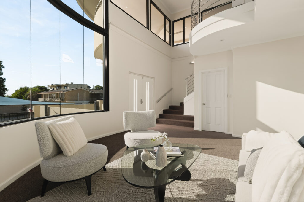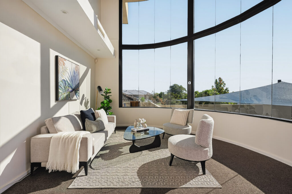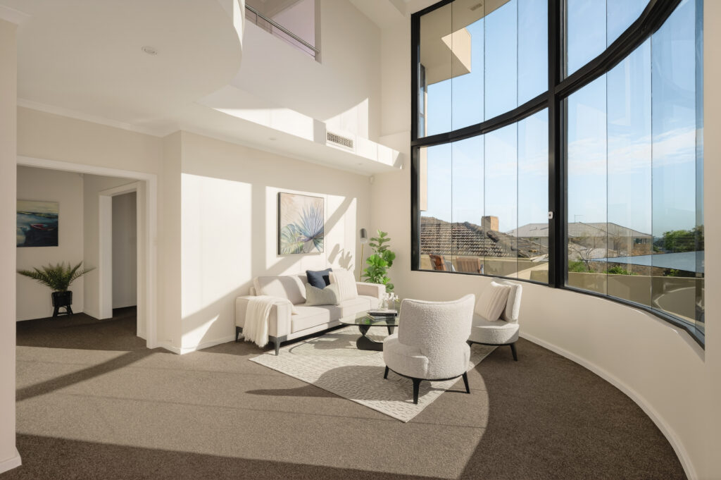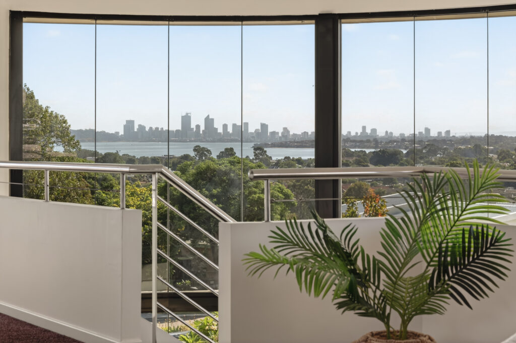 Upstairs, the home truly sets itself apart. A stunning curved wall of glass frames breath taking panoramic views across the Swan River and Perth city skyline, creating a living experience that feels both elevated and unforgettable. Whether it’s morning coffee or evening entertaining, this is a view that will never get old. The master retreat is privately positioned and generously proportioned, complete with its own ensuite and walk-in robe, offering a true sanctuary away from the rest of the home.
