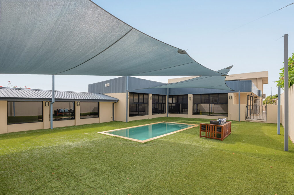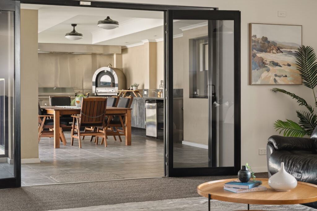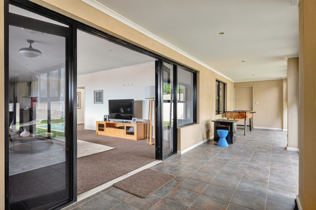 Outdoors, the home continues to impress. The enclosed alfresco with built-in pizza oven sets the scene for year-round entertaining, while the pool area and surrounding spaces provide a private and relaxed environment for family living.