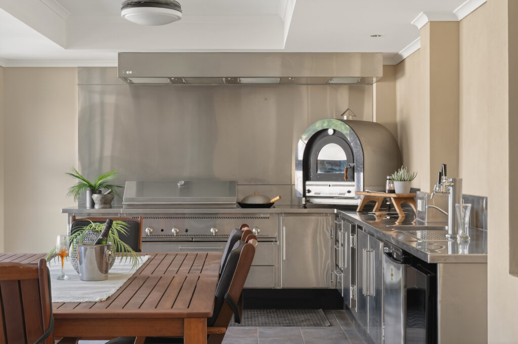 – Fully equipped stainless steel outdoor kitchen with BBQ, pizza oven, fridge and rangehood